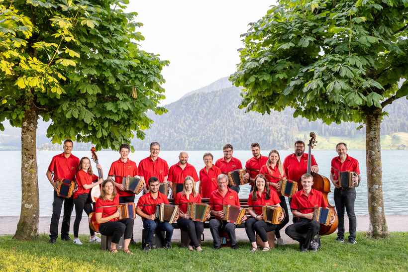 Zur Zeit zählen wir 25 Schwyzerörgeler, eine Bassistin und einen Bassisten zu unseren Mitgliedern - im Alter zwischen 14 und 80 Jahren.